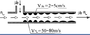 油气润滑又被称为“气液两相流体冷却润滑技术”,压缩空气是润滑油的输送载体。如图7所示,在油气管道中,由于压缩空气的作用,起初,润滑油是以较大的颗粒粘附在管道内壁四周,当压缩空气高速向前流动时,油沿着管壁波浪形地朝着气流方向被输送,油滴逐渐被压缩空气吹散、变小和变得越来越扁平,互相之间的距离也越拉越长,经过约0.5米的管道长度后,原先是间断地粘附在管壁四周的油滴已连成一片,在管壁上形成了一层均匀的连续环状油膜,最后以与压缩空气分离的连续精细油流喷射到润滑点。在油气管道中,油和气的流动速度是不同的,油是沿着管壁流动的,它的流动速度约为2-5cm/s,而气是在管道中间流动的,它的流动速度可达50-80m/s。由于油和气的流动速度大相径庭,所以,油和气不是融合在一起的,从油气管道出来的油和气是分离的,这也是为什么油气润滑不会污染环境的原因。
