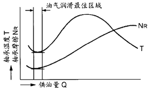 图9是供油量Q、轴承温度T和轴承摩擦NR三者之间的关系曲线。从图中可以看出,当供油量增大到一定程度时,轴承温度呈下降趋势,在这条温度曲线的中部,轴承温度是最高的,因为此时的供油量还没有大到足以降低轴承温度的程度,相反,多余的液体摩擦会产生热量。随着供油量的增大,轴承摩擦也增大,但是,在这两条曲线的最低点恰恰是供油量非常小的时候。由此,我们可以明白,为什么油气润滑只需要极其微小的油量就能达到降低轴承温度和减少轴承摩擦的极佳效果。