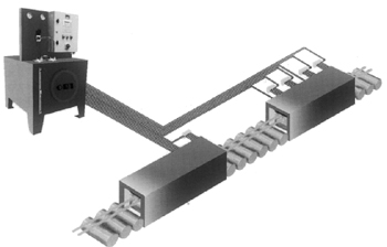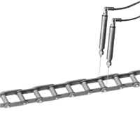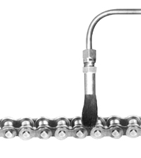 链条的种类很多,有滚子链、板式链、悬挂链、齿形链以及各种异形链等。针对不同种类的链条,有不同的润滑方 式,可采用泵和分配器组成的润滑系统用油刷对链条进行涂油润滑(见图18),也可用脉冲泵对链销进行润滑(见图19);另一种润滑方式,即利用油气润滑的原理对链条进行极其精细的喷射润滑(见图20),一台油气润滑站可同时对输送辊道上的几十根链条进行润滑,这种润滑方式尤其适用于传动速度较快的滚子链。