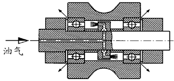 从图21可以看出,进入导心轴的油气流分两路向轴承喷射油气流。油气流进入轴承后,压缩空气从缝隙处溢出。由于压缩空气是连续的和不间断的,又在轴承中保持了一定的过压,因此能对轴承起密封作用,阻止了冷却水和脏物的进入。